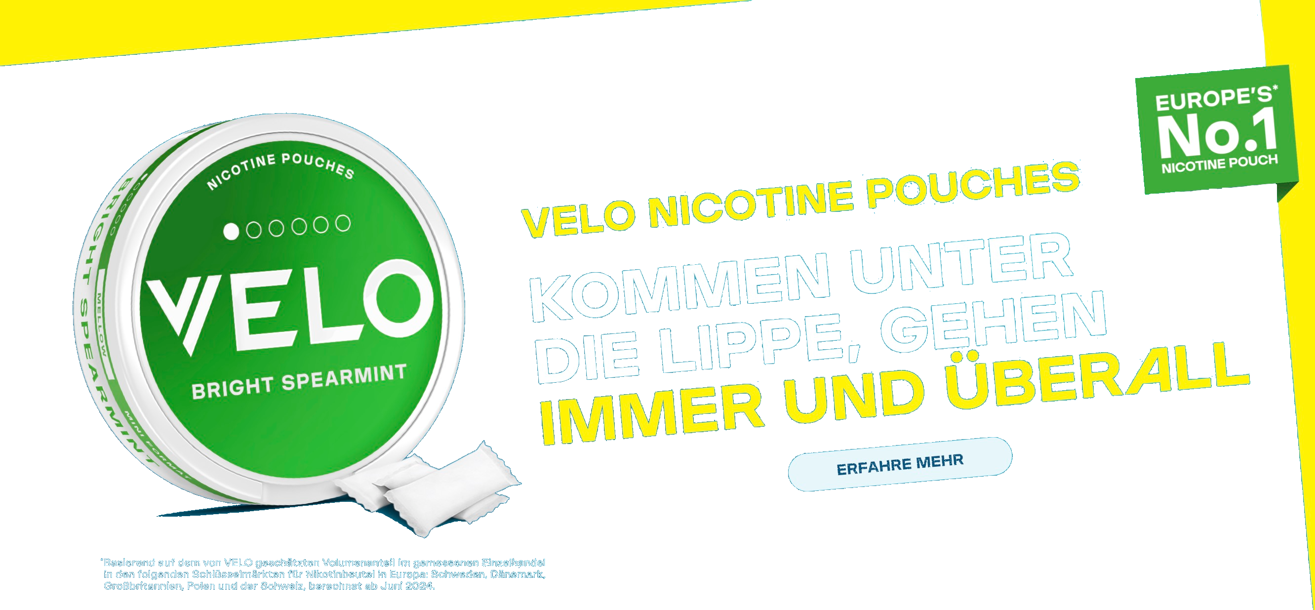**VELO Nikotinbeutel enthalten keinen Tabak und erzeugen beim Gebrauch weder Rauch noch Dampf. Sie verursachen weniger Geruch, keinen Rauch und keine Asche. Dieses Produkt ist nicht risikofrei und enthält Nikotin, eine abhängig machende Substanz.