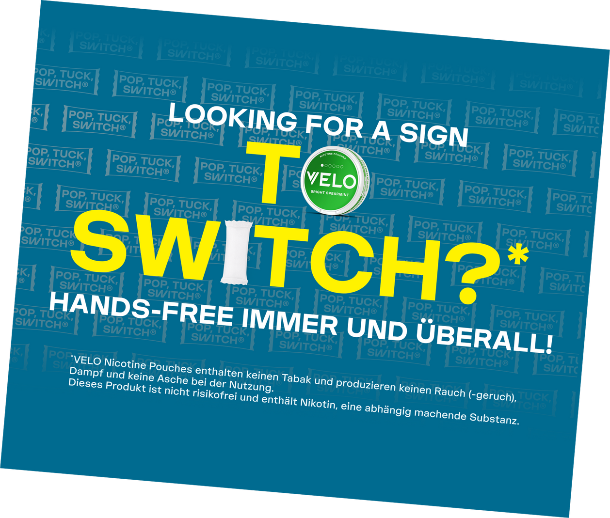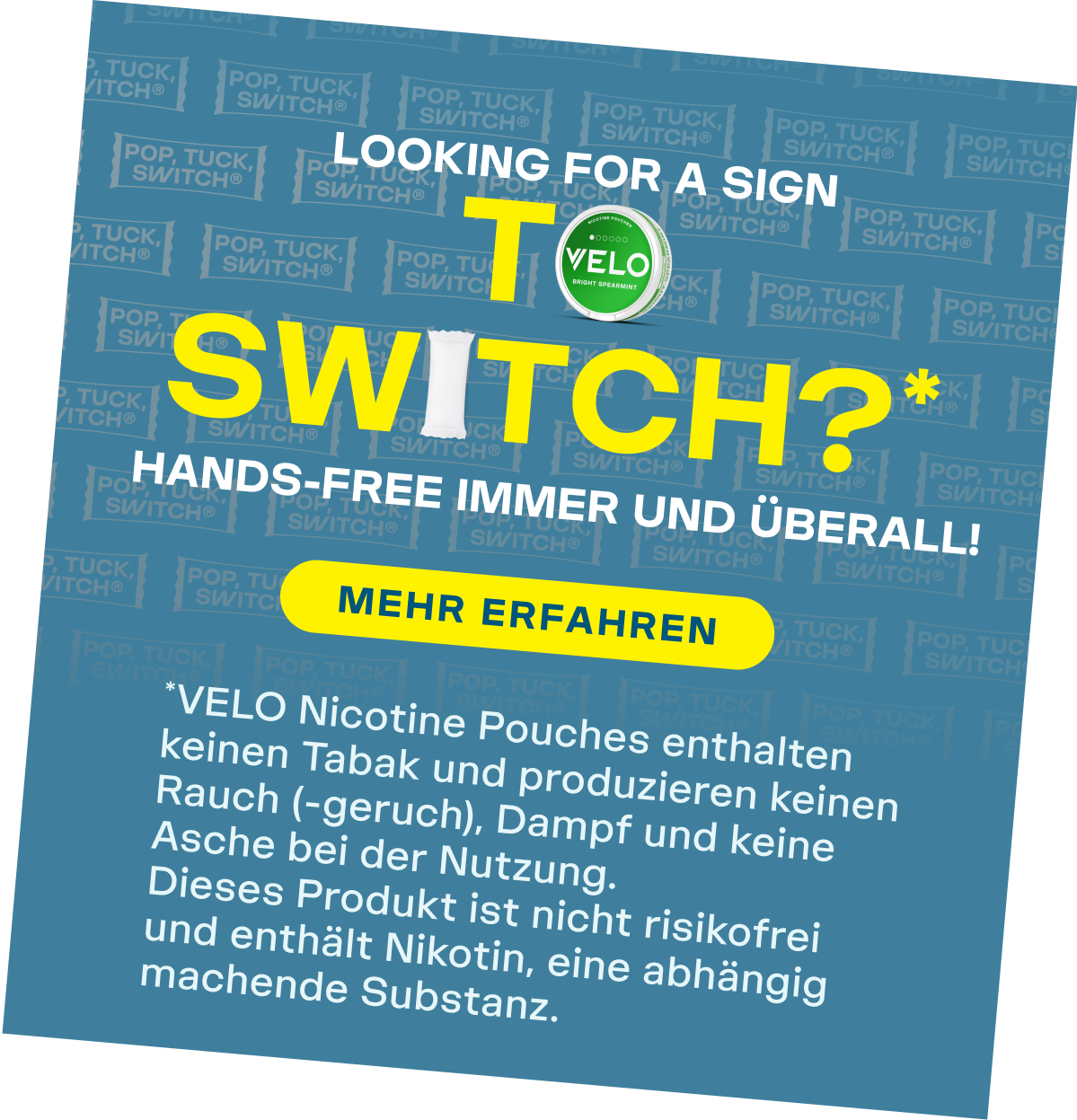 * Dieses Produkt ist nicht risikofrei und enthält Nikotin, eine abhängig machende Substanz. Vergleich basierend auf einer Bewertung von Zigarettenrauch (d. h. einer wissenschaftlichen Standard-Referenz-Zigarette mit ca. 9 mg Teer) undInhaltsstoffen, die während der Verwendung eines Velo-Beutels freigesetzt werden, in Bezugnahme auf die Empfehlung der Weltgesundheitsorganisation zur Reduzierung der Mengen von 9 schädlichen Inhaltsstoffen im Zigarettenrauch.