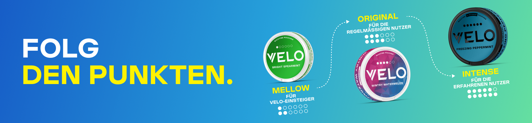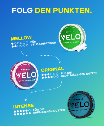 * Dieses Produkt ist nicht risikofrei und enthält Nikotin, eine abhängig machende Substanz. Vergleich basierend auf einer Bewertung von Zigarettenrauch (d. h. einer wissenschaftlichen Standard-Referenz-Zigarette mit ca. 9 mg Teer) undInhaltsstoffen, die während der Verwendung eines Velo-Beutels freigesetzt werden, in Bezugnahme auf die Empfehlung der Weltgesundheitsorganisation zur Reduzierung der Mengen von 9 schädlichen Inhaltsstoffen im Zigarettenrauch.